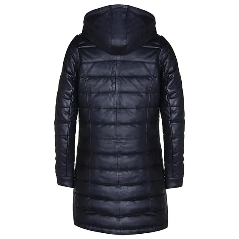 Stay chic in this Black Real Leather Quilted Hooded Overcoat for women. A luxurious and warm long black leather coat, perfect for stylish winter outfitting and modern street style.