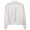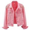 Elevate your casual wardrobe with the must-have Rivet Pearl Short Denim Jean Jacket. This chic, blue denim women’s jacket features elegant pearl and rivet detailing for a sophisticated edge. Perfect for achieving a trendy short jean jacket look, this stylish outerwear is ideal for spring and summer layering. Shop this unique women’s embellished blue denim jacket and add a touch of sparkle to your everyday style.